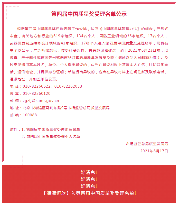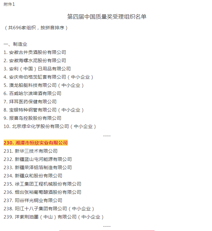 【湘潭恒欣】入第四屆中國質量獎受理名單