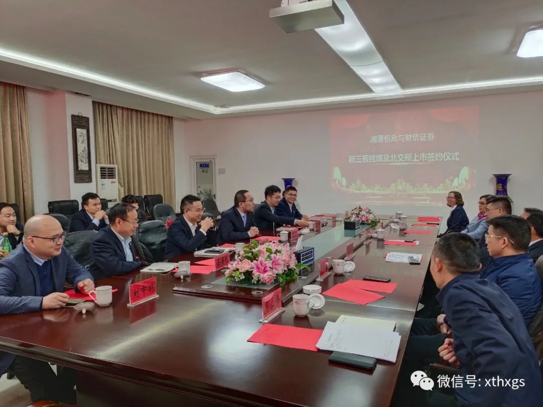 參觀后進(jìn)入會(huì)議室觀看企業(yè)宣傳片,肖董事長向龍海彧副總裁一行的到來表示歡迎并簡要介紹公司的情況和發(fā)展規(guī)劃。隨后龍海彧副總裁和李云祥副首席代表分別進(jìn)行了致辭,韶山市副市長易繼輝發(fā)表了講話。并在大家的見證下,【湘潭恒欣】肖公平和財(cái)信證券副總裁龍海彧簽訂了新三板掛牌及北交所上市協(xié)議。