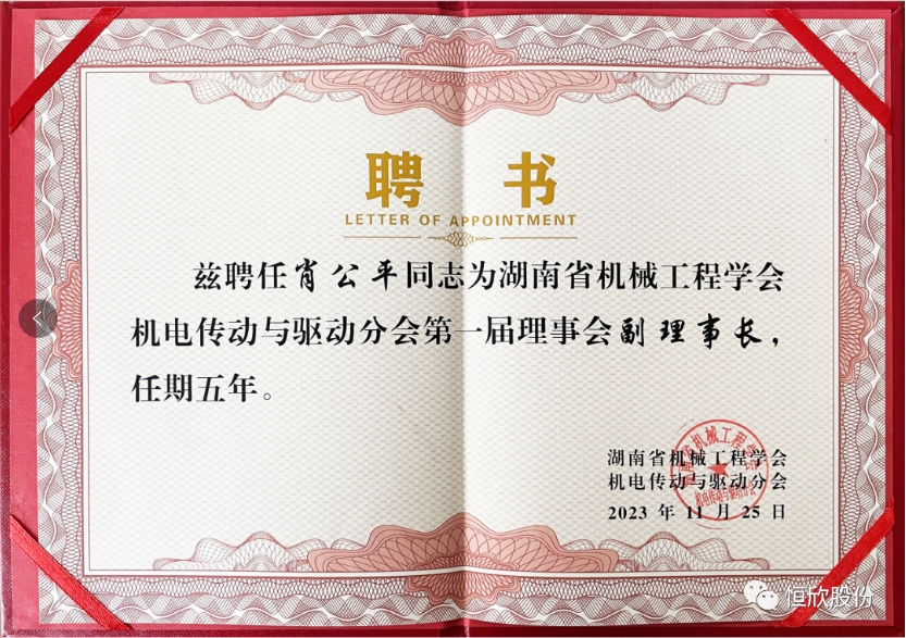 在本次會議中,【恒欣股份】董事長肖公平當選湖南省機械工程學(xué)會機電傳動與驅(qū)動分會第一屆理事會副理事長,這是對我司長期堅持技術(shù)創(chuàng)新的有力詮釋,也將進一步推動【恒欣股份】自主創(chuàng)新、自主研發(fā)的動力,為礦山提供更智能、更高效、更安全的機械裝備。肖董事長表示將認真履行好分會副理事長職責(zé),與分會同仁攜手奮進,不遺余力地為分會工作開展貢獻力量。
