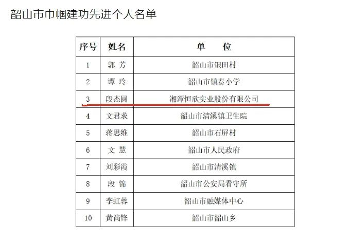 在韶山市第八次婦女代表大會上,表彰了韶山市婦聯(lián)印發(fā)《關(guān)于表彰韶山市“三八紅旗集體”“三八紅旗手”“巾幗建功先進(jìn)個人”的決定》,【恒欣股份】人事總監(jiān)段杰圓榮獲韶山市“巾幗建功先進(jìn)個人”榮譽稱號!她曾先后獲評全國專利信息實務(wù)人才、工業(yè)經(jīng)濟(jì)運行監(jiān)測先進(jìn)個人、韶山高新區(qū)優(yōu)秀共產(chǎn)黨員、湖南省第42次QC小組成果一等獎等榮譽。