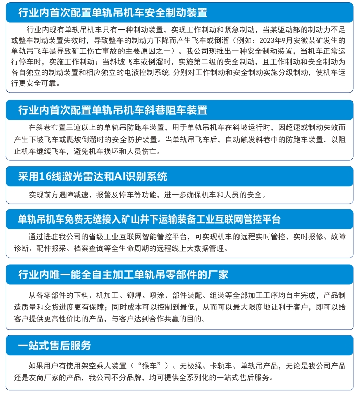 【恒欣股份】單軌吊機(jī)車具有六大優(yōu)勢(shì),投放市場(chǎng)后深受用戶歡迎,被評(píng)定為湖南省2022年度重點(diǎn)工業(yè)新產(chǎn)品,榮獲綠色礦山礦業(yè)裝備質(zhì)量金獎(jiǎng)。
