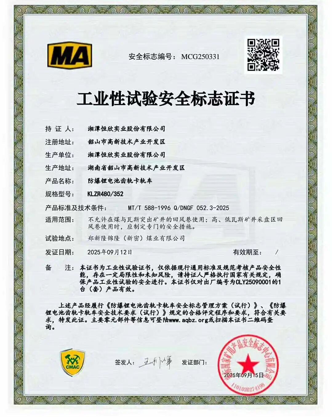 喜訊!【恒欣股份】科研團隊歷時十個月技術(shù)攻關(guān)下成功面世的永磁變頻一體機系列的防爆鋰電池齒軌卡軌車,取得業(yè)內(nèi)首批礦用產(chǎn)品安全標志證書。這一重要突破,標志著【恒欣股份】在礦山智能運輸裝備領(lǐng)域已走在行業(yè)前沿。