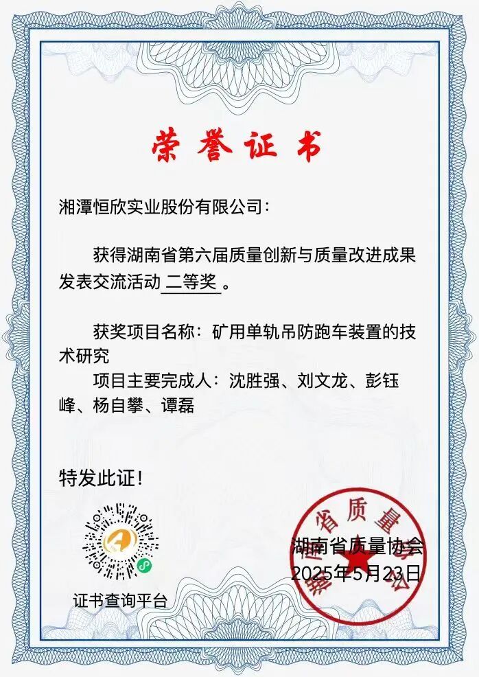 公司質(zhì)量管理工作亦在省級平臺上獲得高度認(rèn)可。在湖南省質(zhì)量協(xié)會第46次優(yōu)秀質(zhì)量管理小組表彰大會上,【恒欣股份】榮獲“湖南省第六屆質(zhì)量創(chuàng)新與質(zhì)量改進成果”二等獎兩項,有軌QC小組獲“湖南省第46次QC小組成果二等獎”,充分體現(xiàn)了公司在質(zhì)量創(chuàng)新與實踐方面的綜合實力。