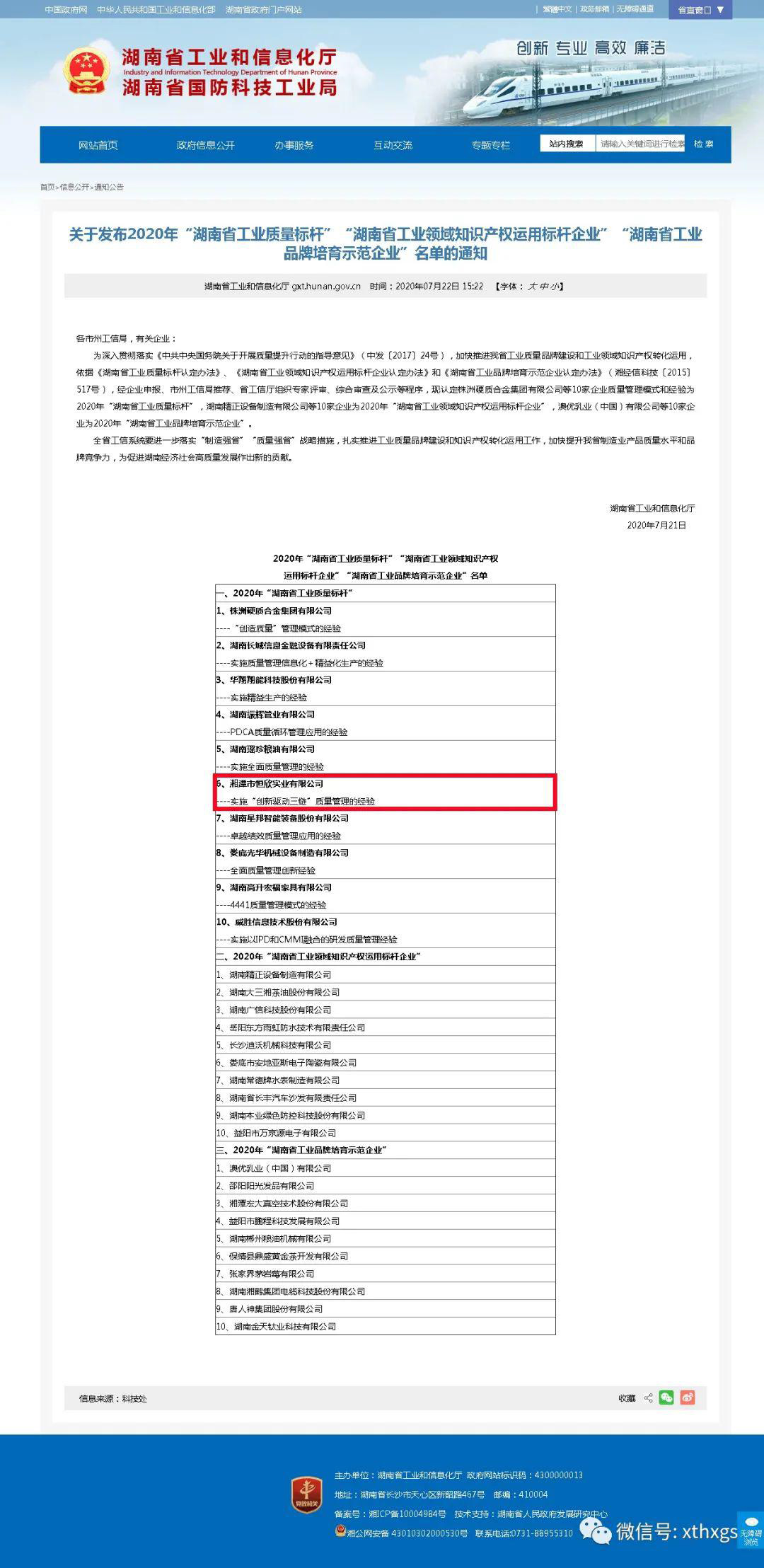 熱烈慶?!鞠嫣逗阈馈勘徽J定為2020年“湖南省工業(yè)質(zhì)量標桿”