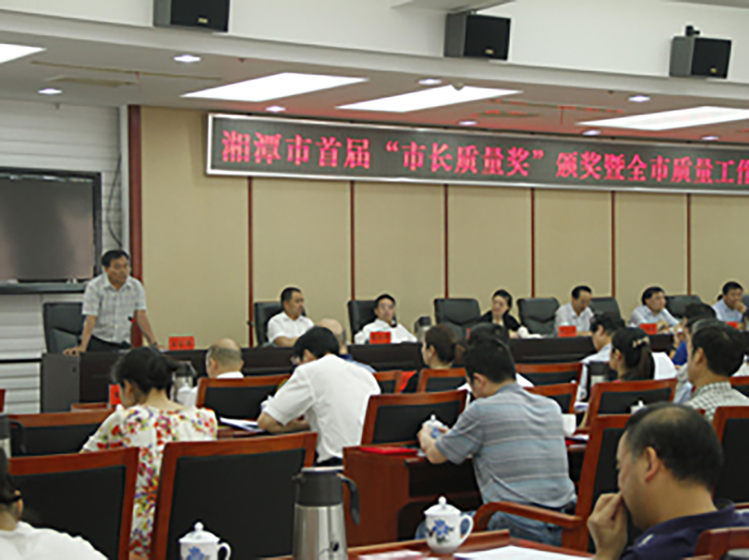 6月13日,湘潭市首屆“市長質(zhì)量獎”頒獎暨全市質(zhì)量工作會議在湘潭市政府會議室召開,省質(zhì)量技術(shù)監(jiān)督局蔣新祺局長、湘潭市委副書記、市長胡偉林、副市長吳小月等領(lǐng)導(dǎo)參加了會議。
