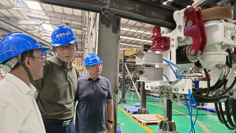 在肖董事長的陪同下,王部長一行先后視察了企業(yè)榮譽展廳、數(shù)控車間、機器人焊接車間、單軌吊試驗區(qū)以及無人駕駛運行監(jiān)控中心等區(qū)域。