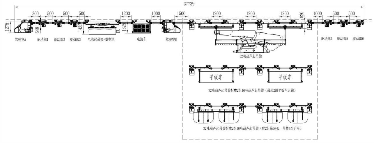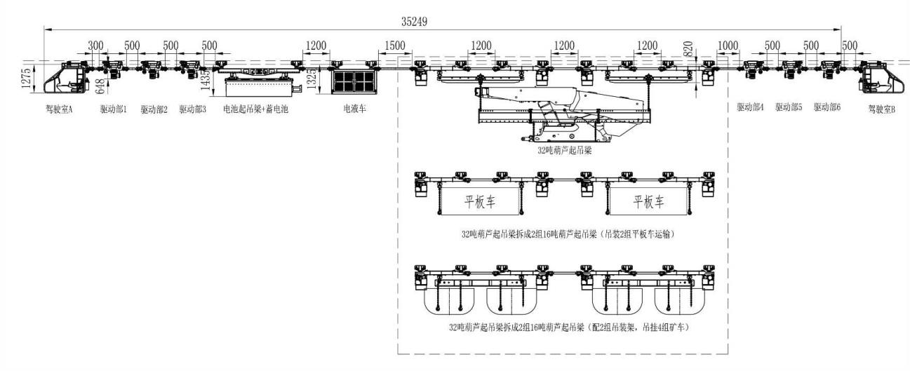 方式二:起吊梁位于最前端位置,適用于直接將液壓支架運(yùn)輸?shù)焦ぷ髅媲醒畚恢眠\(yùn)輸方式,采用葫蘆驅(qū)動形式起吊梁,也可拆解為小噸位起吊梁,用于運(yùn)輸平板車、礦車等小型貨物。