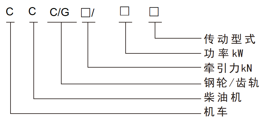 示例:CCG / C 5 3 8 / 1 6 0 Y:煤 礦 用 防 爆 柴 油 機(jī) 鋼 輪/齒 軌 機(jī) 車 ,牽 引 力53 8 kN ,柴 油 機(jī) 功 率 160kW, 液壓傳動。