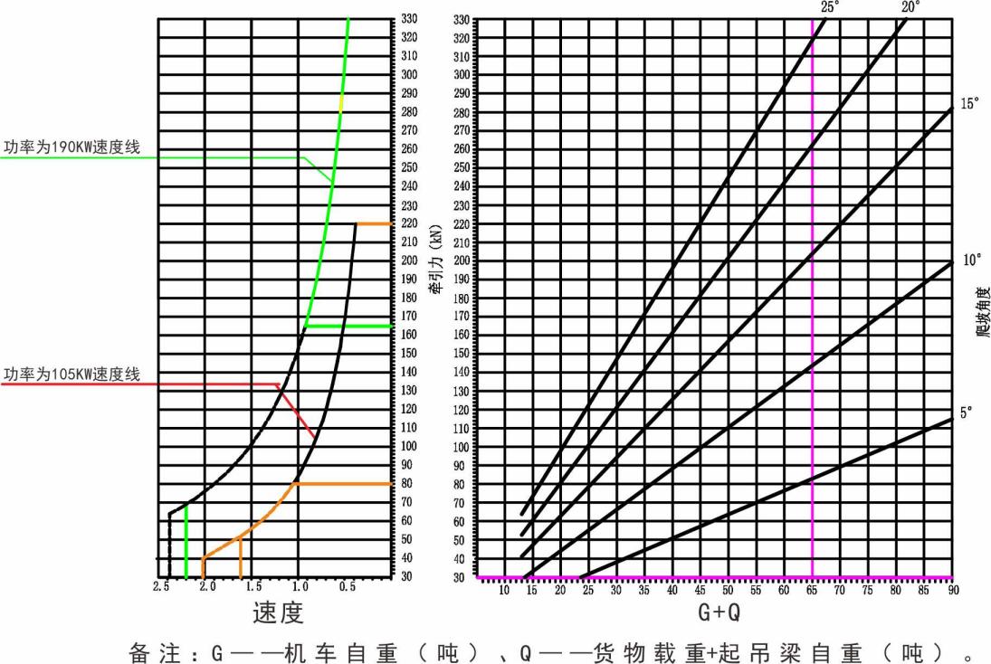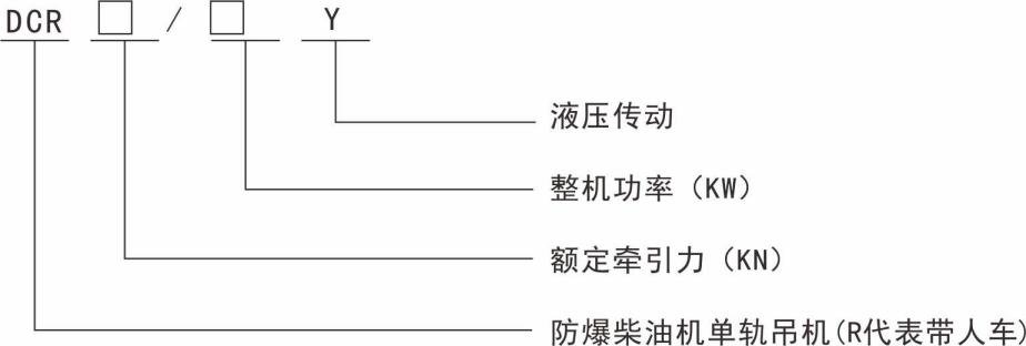 示列:型號DCR390/160Y,表示額定牽引力390KN,柴油機功率160KW,柴油機動力液壓驅動單軌吊機車。