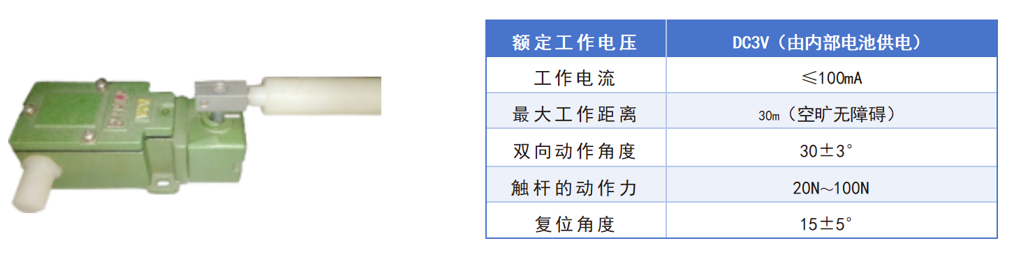 采用單級雙向跑偏開關(guān),具有體積小、重量輕、強(qiáng)度高的特點(diǎn);觸桿外套阻燃尼龍棒,能靈活 滾動(dòng)伸縮,具有耐磨、適用性強(qiáng)的特點(diǎn)。主要應(yīng)用于煤礦輔助運(yùn)輸設(shè)備的電氣信號檢測。