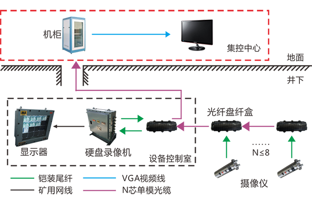 況進(jìn)行實(shí)時(shí)監(jiān)視,硬盤錄像機(jī)通過光纖接收視頻信號(hào),通過顯示器進(jìn)行顯示和切換,實(shí)現(xiàn)地面和井下視頻信號(hào)實(shí)時(shí)顯示和存儲(chǔ)的目的。