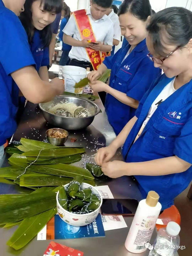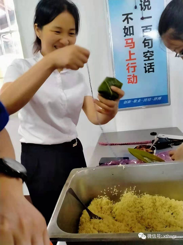 本次比賽共分為21組,每組4人,角逐"數(shù)量最多獎(jiǎng)”和“最美粽子獎(jiǎng)”。比賽前,進(jìn)行了關(guān)于端午節(jié)相關(guān)知識及【中國銀行】和【湘潭恒欣】企業(yè)文化知識搶答。隨著【中國銀行】周行長吹響比賽口哨,活動(dòng)氣氛高漲,平時(shí)在車間搬鐵動(dòng)械、在家翹著二郎腿的大老爺們也開始像模像樣地“捉粽子”了;上得廳堂、下得廚房的女士們輕松地包了一個(gè)又一個(gè)有棱有角粽子。雖然比賽只有十分鐘,但速度可不慢,最快的一組共包了40多個(gè)粽子哦?!鞠嫣逗阈馈客聜冋f往年都是買粽子吃,今年可以吃到自己親手包的粽子,感覺特別好,特別幸福,印證了習(xí)大大的金句:“幸福是奮斗出來的”。