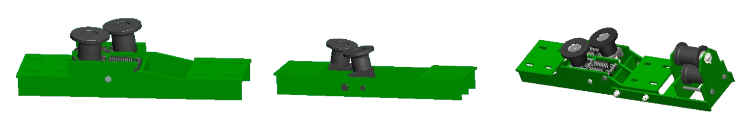 由于巷道條件復(fù)雜,線路中會(huì)出現(xiàn)變坡,鋼絲繩在往復(fù)運(yùn)轉(zhuǎn)的過(guò)程中會(huì)出現(xiàn)懸空或者脫離運(yùn)輸軌道的現(xiàn)象,因此需要使用壓繩輪組對(duì)鋼絲繩定位,